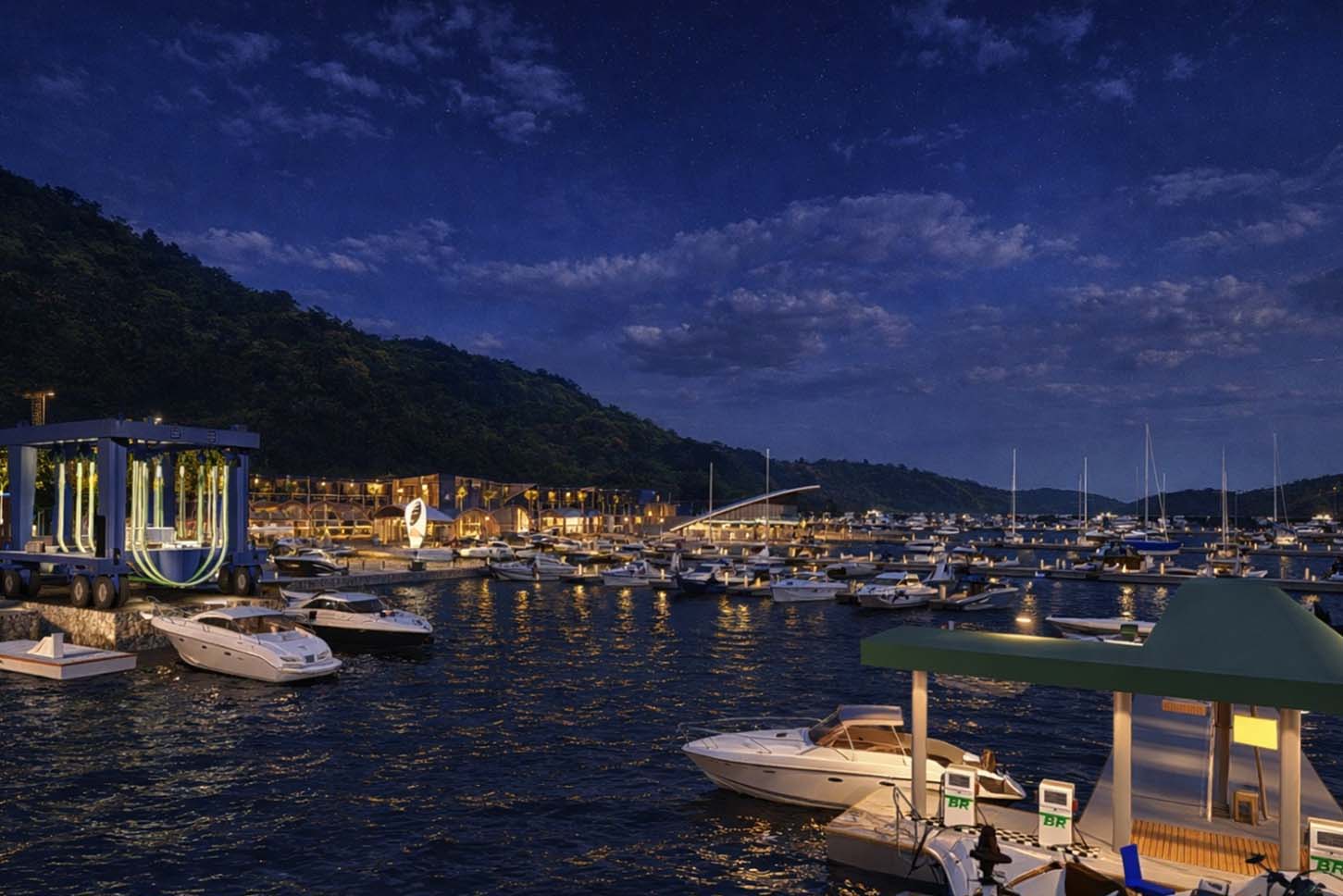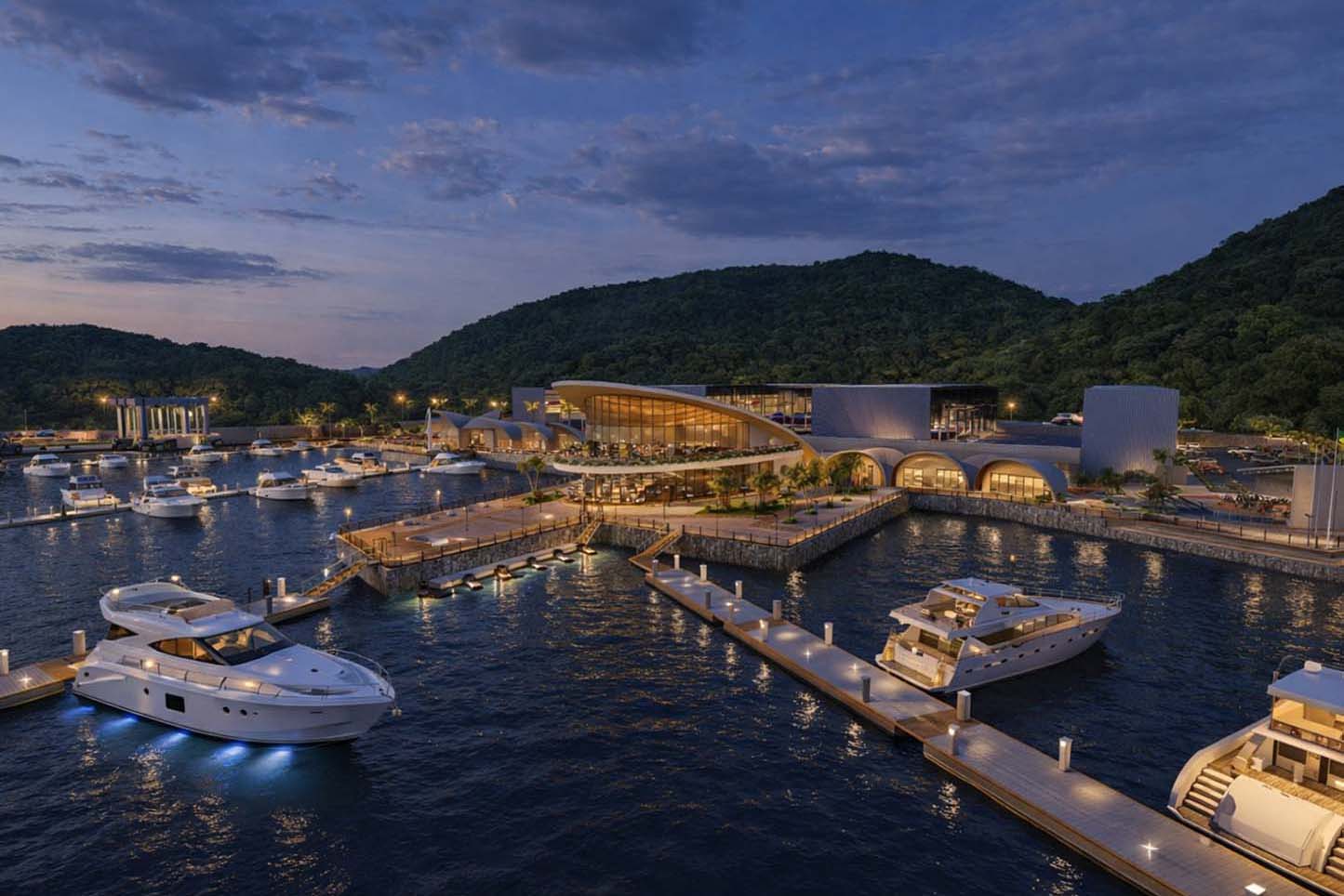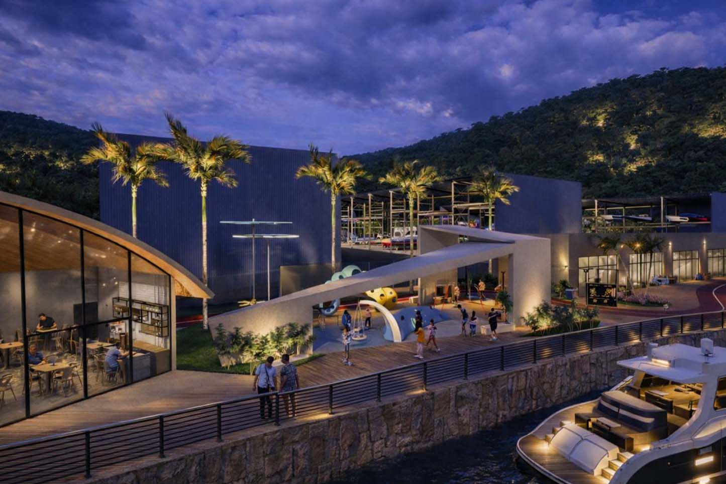 A marina, principal estrutura do empreendimento, contará com 303 vagas molhadas (para embarcações atracadas na baía) e 400 vagas secas (para embarcações alocadas internamente). Também está previsto estacionamento para 208 veículos, espaços de convivência, lazer e serviços, incluindo restaurantes, lojas e estrutura para eventos.
