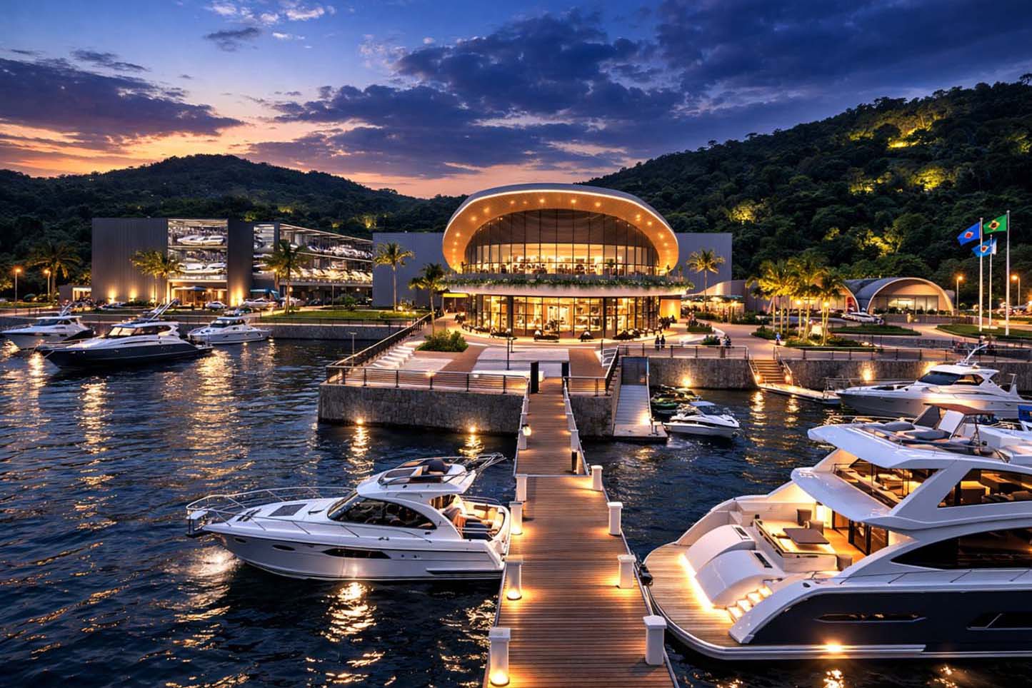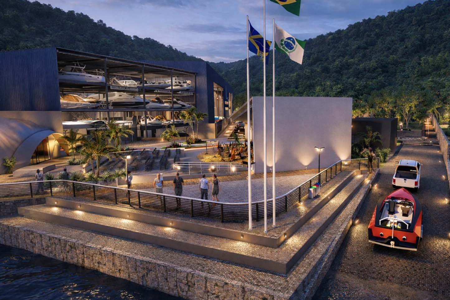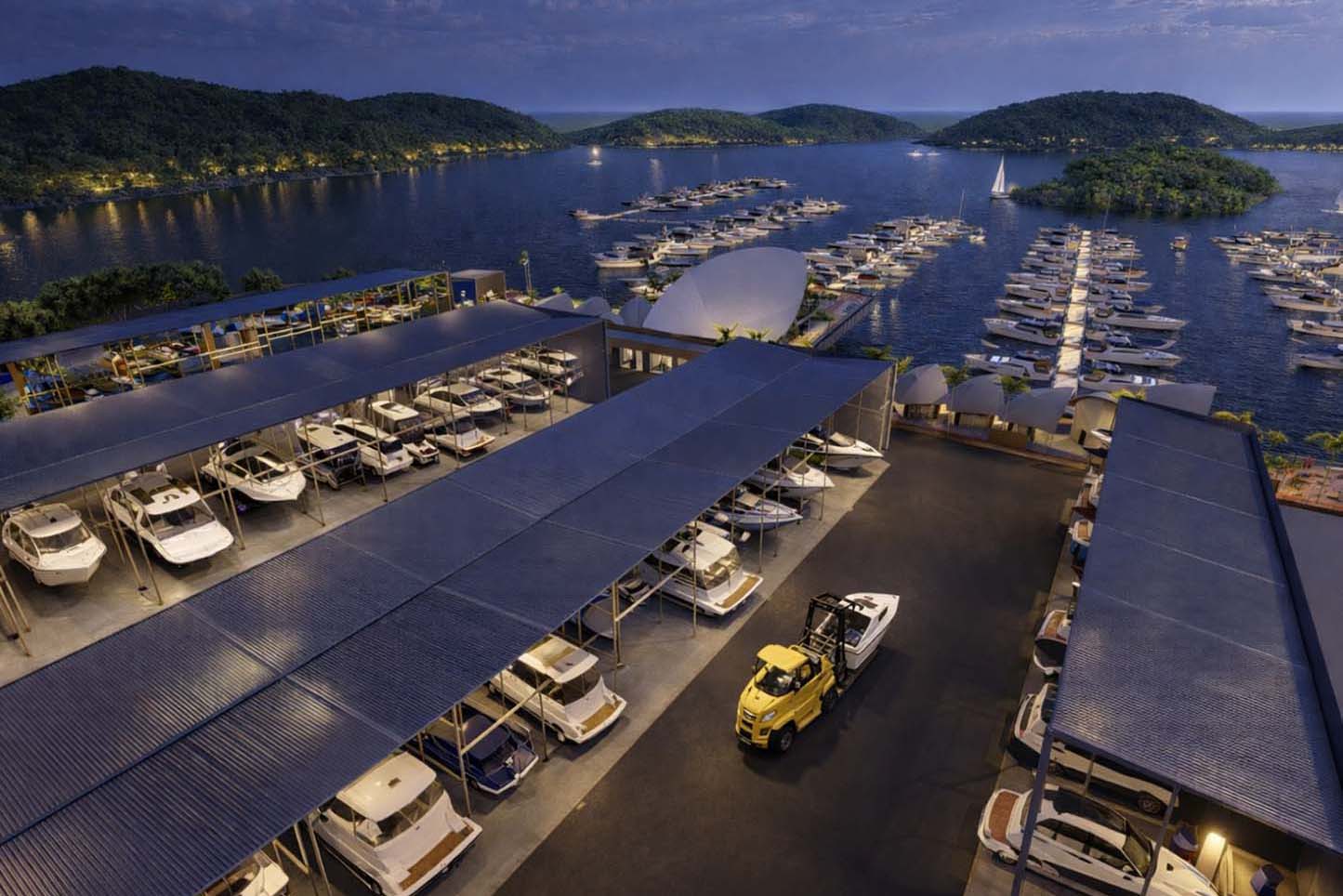A marina, principal estrutura do empreendimento, contará com 303 vagas molhadas (para embarcações atracadas na baía) e 400 vagas secas (para embarcações alocadas internamente). Também está previsto estacionamento para 208 veículos, espaços de convivência, lazer e serviços, incluindo restaurantes, lojas e estrutura para eventos.